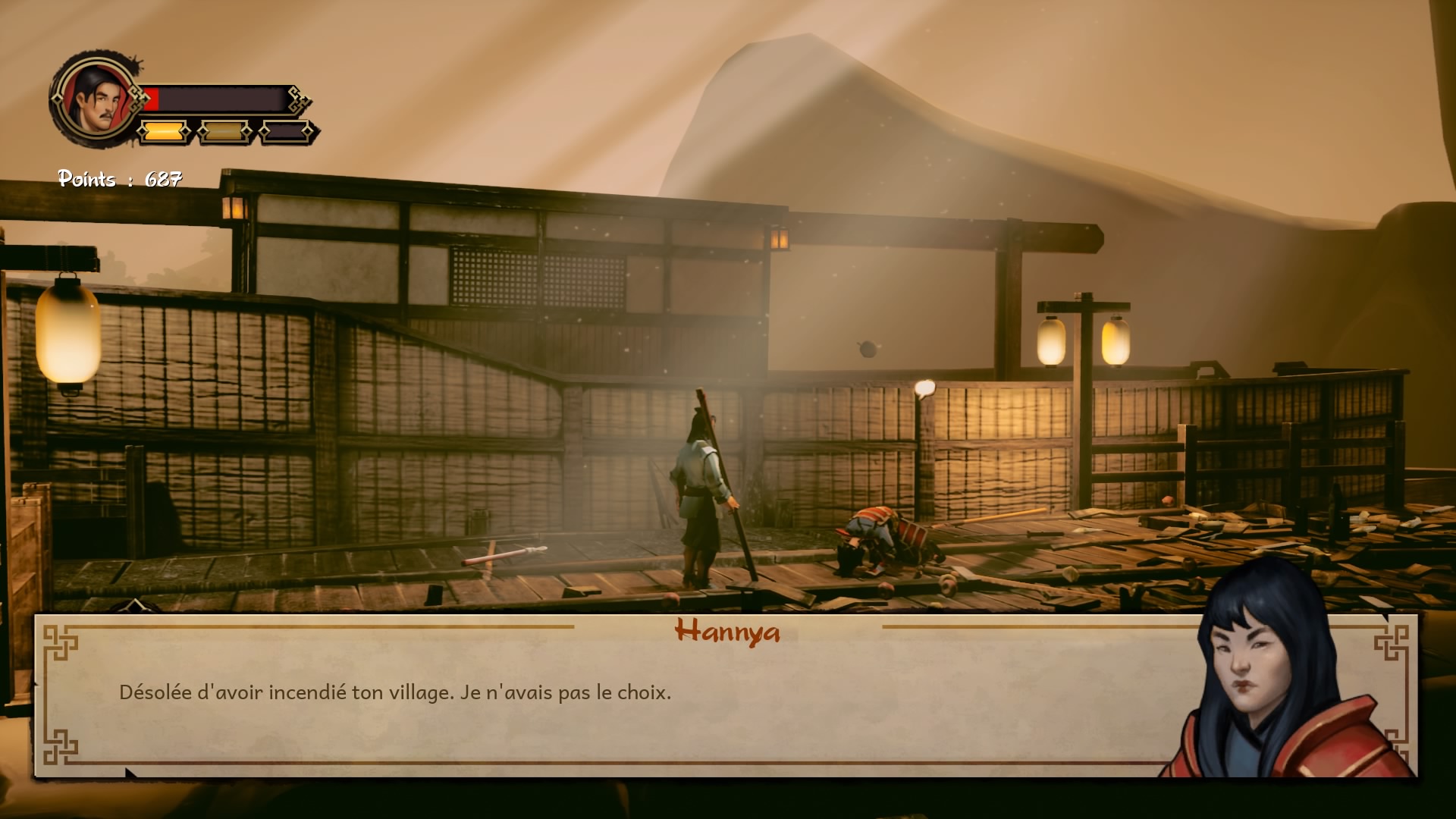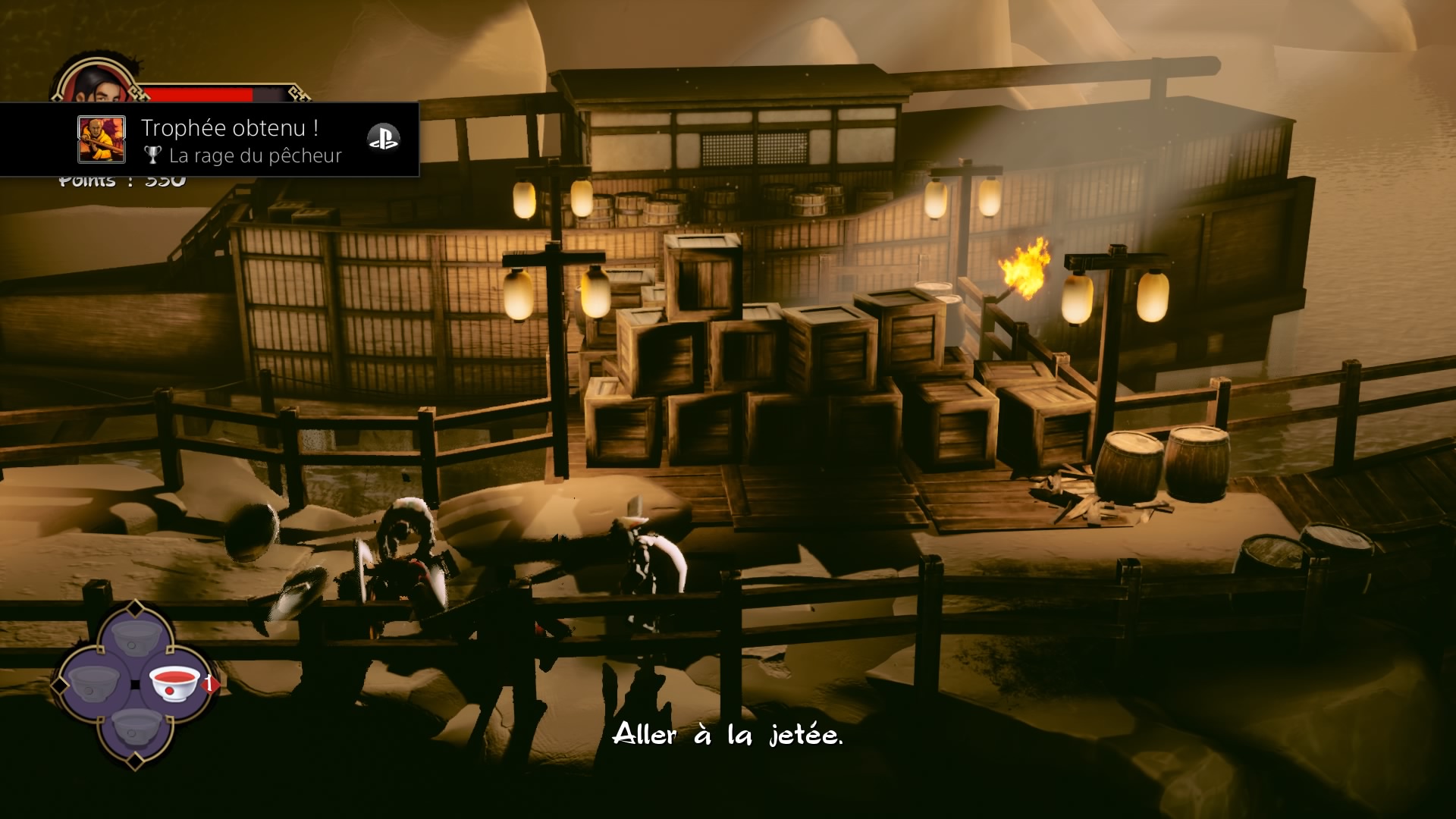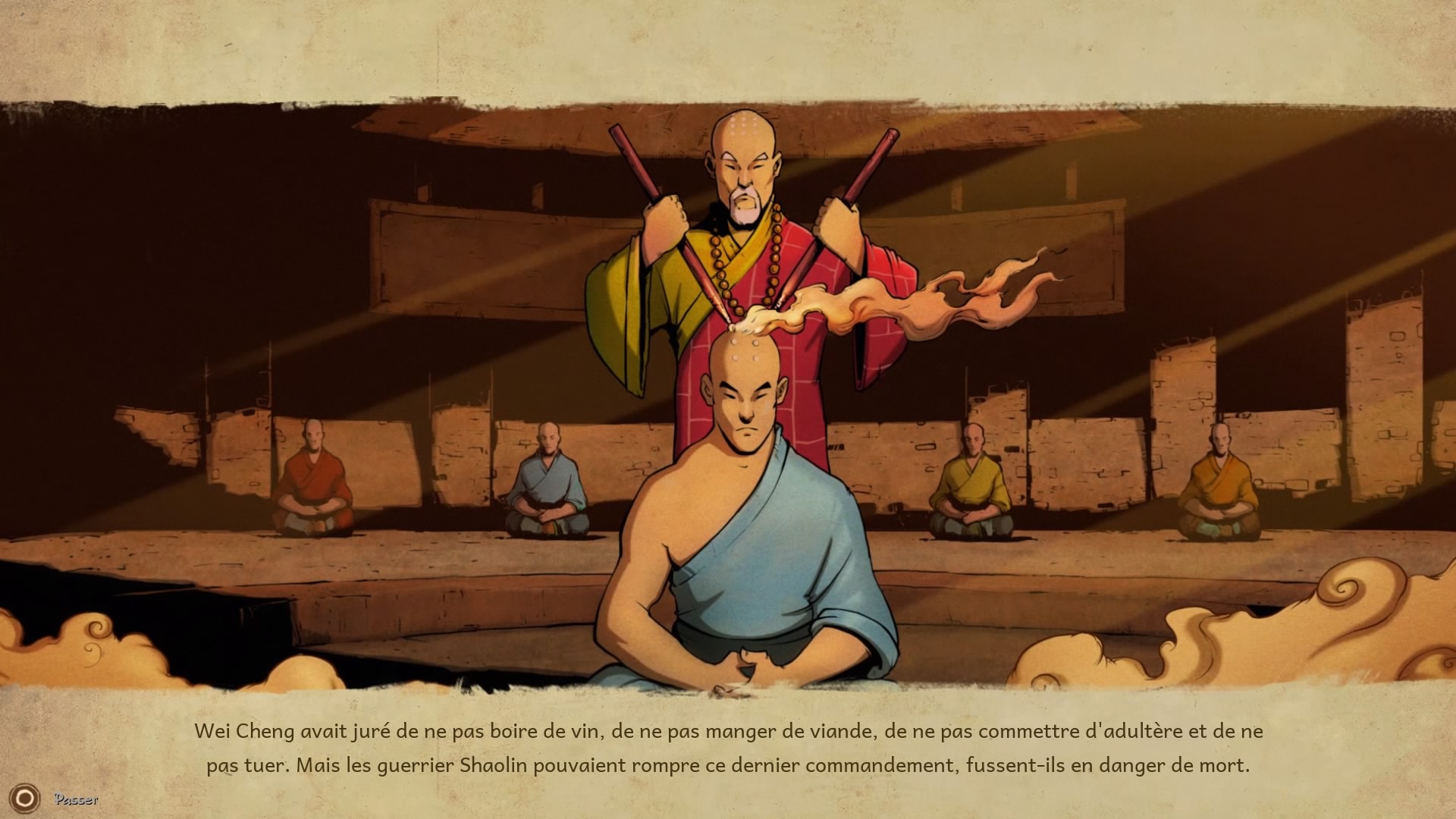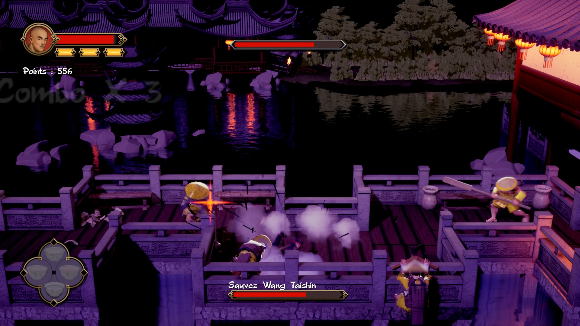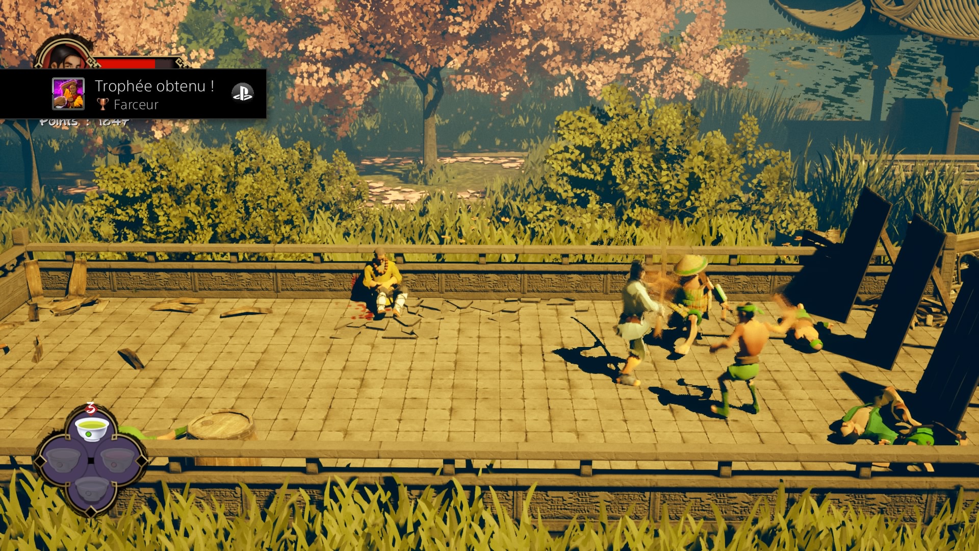 Nous voici donc lancé au coeur de ce beat-them-up que l’on peut qualifier de « à l’ancienne ». Pourquoi à l’ancienne, car comme il était de rigueur à l’époque ce sont des tableaux à défilement horizontal remplis d’ennemis qui cherchent à vous barrer la route. Le gameplay est très simple et rapide à prendre en main, 3 boutons pour les attaques (carré, triangle, rond), un bouton d’esquive (X) et enfin la croix directionelle va vous permettre d’ingérer différent type de thés que vous trouverez tout au long des stages dans des caisses que vous devrez briser. La technique de parade (R1) vous permettra de vous débarrasser des ennemies equipés d’armes de jet. Vous apprendrez aussi au fil du temps des techniques plus puissantes (mais aussi plus dures à réaliser), comme l’utilisation du Qi.